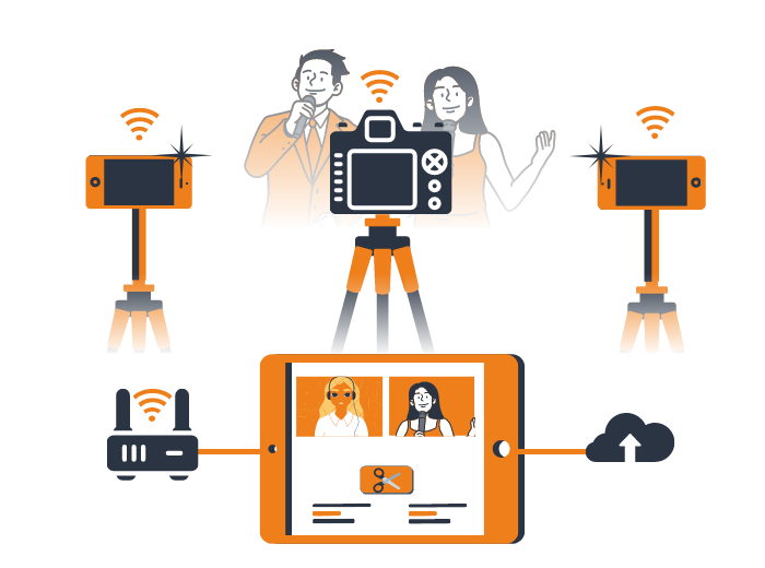 Statt schwerer, breiter TV-Kamera-Technik, setzen wir auf moderne HD-Smartphones und handliche Zoom-Kameras. Und statt mit Kabeln, verbinden wir unsere Kameras mit unserem eigenen WLAN-Funk.